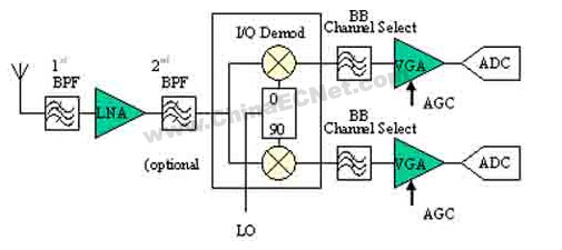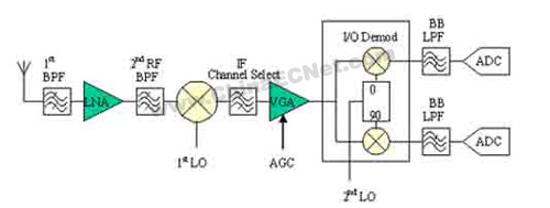 针对基站的超外差接收器,固定增益LNA常被用于接收信号的最初放大。包括噪声在内的整个通带频率转换成固定IF。虽然仍需要一个高LO功率(大于+10dBm)来驱动这一混频器,但为了降频转换,无源(二极管)混频器还是最常用以满足高线性和低噪声动态范围要求的混频器。由于无源混频器的典型特点是LO至IF的隔离性差,这使得接收器IF部分的LO过滤变得复杂化。在混频器的IF输出端,有用信号频道处于IF频道选择滤波器的中心位置,此滤波器用于去除无用的相邻频道或相隔频道。 紧随IF频道选择滤波器之后,可用频道经可变增益放大器放大后,解调到基带中进行信号处理。高品质因数(Q)的IF频道选择滤波器让可用信号顺利通过,将包括振幅较大的备用频道信号在内的无用信号排除在外。然而,这样的选择滤波器非常昂贵,不合理地提高了超外差接收器的成本。此外,高Q滤波器的插入损耗通常很高,需要LNA和混频器级的额外增益以抵销滤波器损耗和降低VGA噪声指数。 由于在基站接收器中LNA增益固定,混频器必须达到很高的线性度才能满足系统严格的动态范围要求。此外,IF频道选择滤波器拥有能精确调整到所需频道带宽的频率响应功能。IF频道选择滤波器的不灵活性限制了接收硬件,使后者只能适应单一的RF标准。由于无线通信标准的多样性,新型接收系统必须在用于支持某一种标准的有限成本预算下,实现无缝有效地支持不同标准。