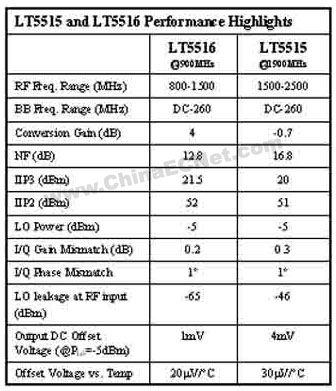 幸运的是,凌特公司LT5515和LT5516 I/Q解调器是现有为数不多并能提供这类性能的经济型产品。这两款IC均集成了RF信号分离器、精确正交LO信号分配器和两个高线性度下变频混频器的功能。这些芯片能直接将RF信号降频转换到基带,解调同相(I)和正交(Q)信号成份。它们匹配的I和Q频道以确保精确增益和相位匹配,以致很大程度上减少了校准的需求。LT5515的工作范围是1.5到2.5GHz,LT5516则能处理0.8到1.5GHz范围内的RF输入信号。这些芯片还在每条I和Q频道上集成单极点260MHz带宽的低通滤波器 (见表格1) 。