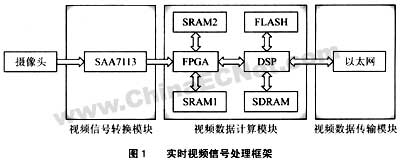 虽然视频信号处理的需求多种多样,但数据处理的流程都遵循数据采集、格式转换、数据接收、数据计算、数据通信的步骤,图1所示是基于FPGA和DSP的实时视频信号处理框架。