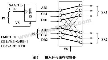 在图2中,输入缓冲电路的上游接视频解码器SAA7113,下游接DSP(需要解码时,输出缓冲电路上游接DSP,下游接视频编码器)。对于大多数A/D转换器,由于其仅具有并行数据输入输出端口,而没有地址和控制信号输出口,故它无法直接对普通SRAM进行读/写操作,因而要求乒乓缓存控制器本身具有地址产生功能,故必须增加地址产生逻辑,其中,CLK为AD(或DA)转换时钟,它作为计数器的脉冲源,而计数器的输出端则提供了SRAM寻址线。该图中,DB1接AD转换器SAA7113的数据输出端(或DA转换器的数据输入端),CB1为读写使能信号,而对AD转换器而言,因其是恒定输出器件,故P1口CB1的/RE应恒接高,/WE恒接低(对DA转换器而言,因其是恒定输入器件,故P1口CB1的/RE应恒接低,/WE恒接高),P2口接DSP外存接口(EMIF)之CE0空间,DB2接DSP的数据总线ED,AB2接DSP的地址总线AD。工作时,数据从视频解码器输出到乒乓缓冲器,经缓冲之后输入到DSP的EMIF外存空间,以备处理。其中,AD转换时钟SAA7113 CLK作为计数器的计数脉冲,以产生地址线AB1;场同步信号VS用于复位计数器,这意味着乒乓缓存的容量(亦即SR1、SR2的容量)为一场的视频数据。