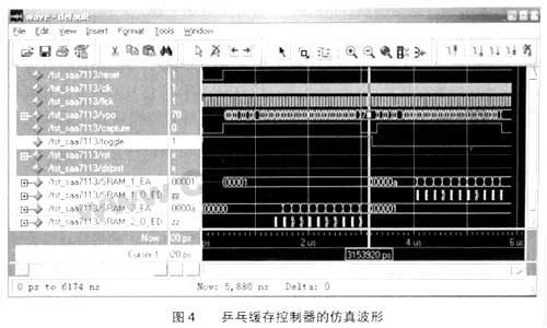 图4是其仿真波形。在控制信号toggle=1时,DSP的EMIF连接到SR1,以从SRAM1中读取视频数据,同时SAA7113将数据写到SRAM2,在控制信号Toggle=0时,DSP的EMIF连接到SR2,以从SRAM2中读取视频数据,同时SAA7113写数据到SRAM1,此过程如此循环,便可实现大量高速视频数据流的无缝缓冲和处理。